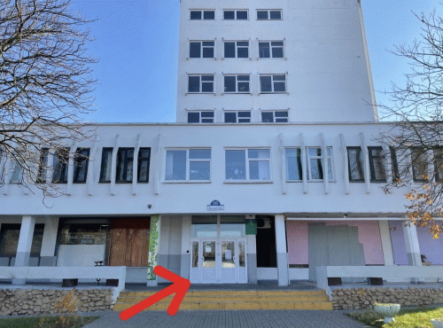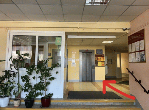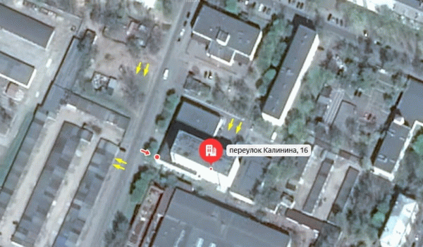 Желтыми стрелками - место парковки. Красной - вход в здание